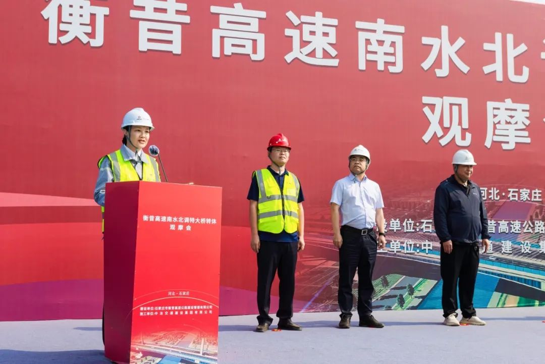 吳國洪在致辭中對支持和幫助項目建設發(fā)展的各級政府及相關單位表示感謝,并向所有一線建設者致以崇高的敬意。她表示,衡昔高速公路是河北省“十四五”規(guī)劃的重點民生工程。作為施工單位,中國五礦、中國中冶、中冶交通始終堅持“生態(tài)優(yōu)先、綠色發(fā)展”,在“加快建設交通強國”中勇當先鋒,充分發(fā)揮在綠色施工、技術創(chuàng)新等方面的專業(yè)優(yōu)勢,由數(shù)百名各類專業(yè)工程師經(jīng)過17個月的不懈努力,最終優(yōu)質(zhì)高效完成了全國首座跨越南水北調(diào)干渠且結(jié)構(gòu)形式復雜的矮塔斜拉轉(zhuǎn)體特大橋施工任務。未來,公司將繼續(xù)在石家莊市委市政府、市交投、市高速集團、市衡昔高速公路建設管理有限公司等各級政府和單位的大力支持下,積極融入地方經(jīng)濟發(fā)展,在民生保障、生態(tài)保護、“雙碳”建設、重大基礎設施、城市更新等領域,為加快建設現(xiàn)代化、國際化美麗省會城市貢獻中冶智慧。同時項目管理團隊也會以此次順利轉(zhuǎn)體作為新起點,按照施工要求精心組織,進一步振奮精神,全力沖刺,力爭早日完成衡昔高速項目的全線貫通。